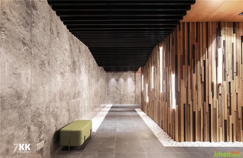 地下室走廊空間,黑色鋁條造型吊頂,左側(cè)大面積植物造型墻,右側(cè)整面豎條舊木板造型墻,定制豎條壁燈,走廊地面兩側(cè)的白色鵝暖石,橫豎線條錯(cuò)落有序的搭配,整個(gè)空間層次分明,簡(jiǎn)約大氣時(shí)尚。