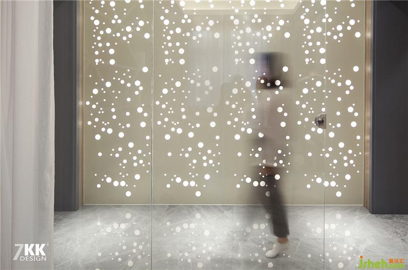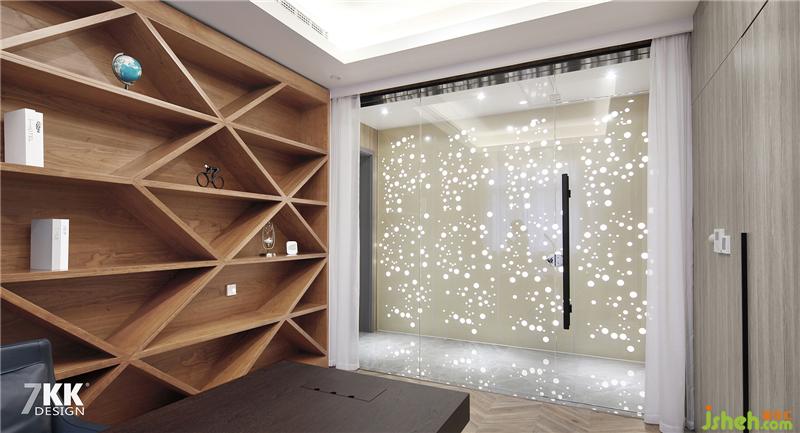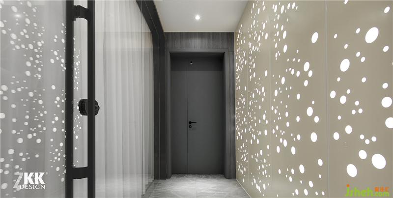 走廊左側(cè)是書房,另一側(cè)是主臥的大衣帽間,走廊右側(cè)的墻面采用木板墻內(nèi)藏?zé)魩?,在透光孔的穿梭下映射到書房玻璃門上,光與影的結(jié)合讓整個(gè)走廊如同仙境蘇州室內(nèi)設(shè)計(jì)師。