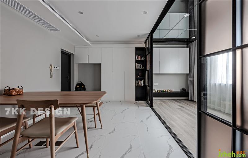 拉開玻璃移門,客餐廳面積瞬間變大。餐廳餐桌椅后面墻上一塊圓形藝術(shù)裝飾品作為點綴,剩下的空間盡量留白,多份想象,達到極簡的空白藝術(shù)。