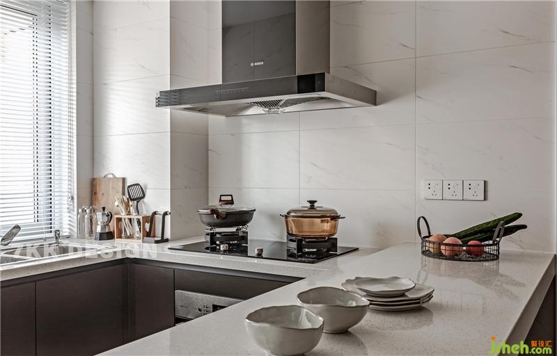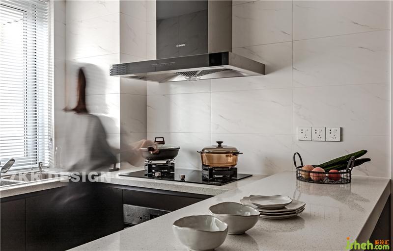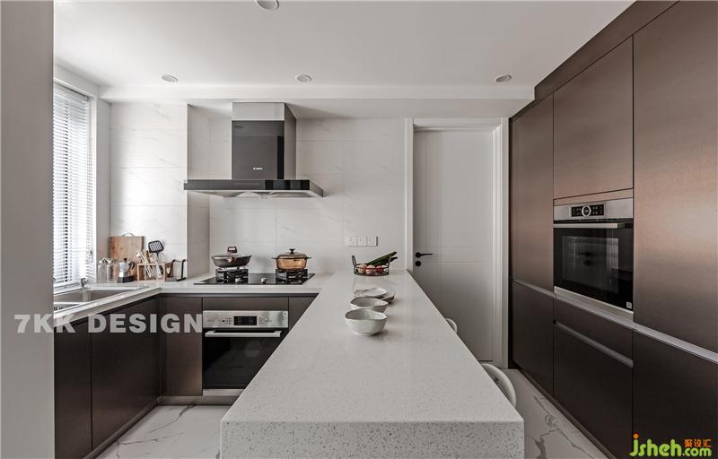 廚房打破原有封閉的空間,充分利用過道,打造開放式廚房,空間上顯得更加通透,同時擁有更開闊的操作空間。吧臺連接廚房操作臺,U字型設(shè)計,最大化利用空間。吧臺右側(cè)選用科勒的整體櫥柜,采用嵌入式微波爐,烤箱,讓整體空間更干凈整潔。