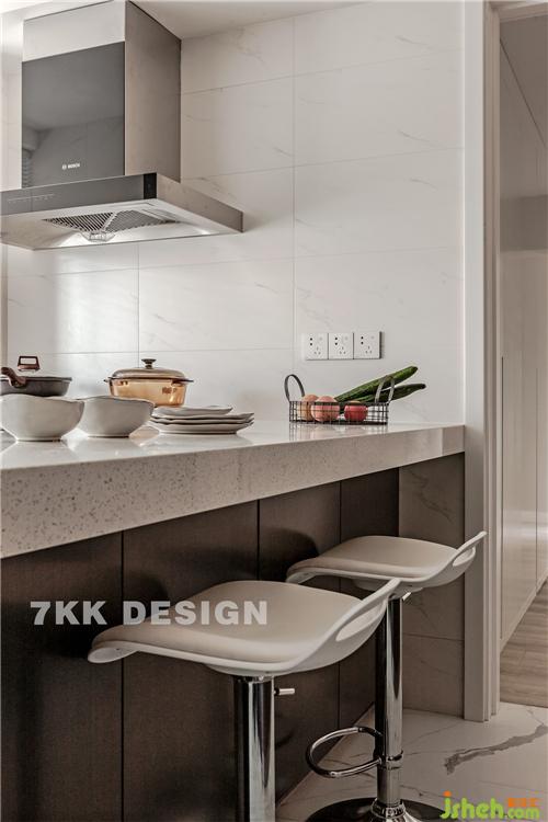 吧臺采用水磨石臺面,燒完的飯菜隨手擺放很方便。臺面下方做成柜體形式,為小小的廚房空間增加更多的收納功能。簡約高腳凳搭配,早晚餐可以很方便在吧臺解決。