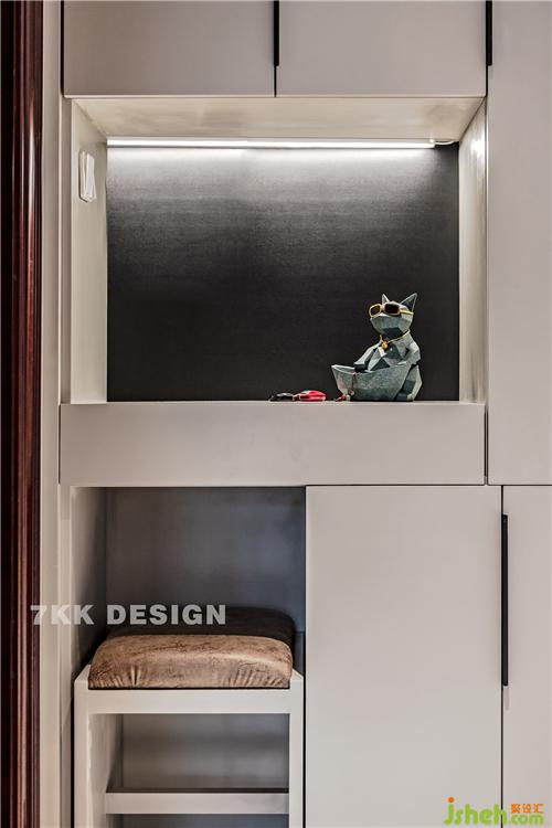 玄關鞋柜定制到頂,柜體預留換鞋凳的空間,因為家里有老人,坐著換鞋會比較方便,使用的時候把鞋凳拿出來,放回去也比較方便,比較節(jié)省空間。中間鏤空放置隨身進出的物品鑰匙包包等,內藏的燈帶補充光源增加美觀。