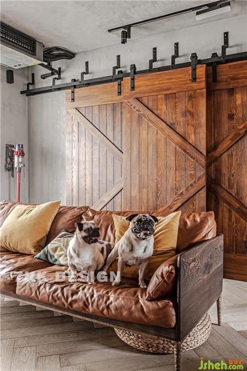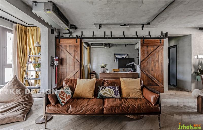 原本客廳和臥室相連的墻面被敲掉,做成多功能房間,利用三扇谷倉門隔斷,高顏值與實(shí)用性并存。頂上加了一個可三聯(lián)動的鐵藝軌道與工業(yè)風(fēng)完美結(jié)合,個性、粗獷、神秘!