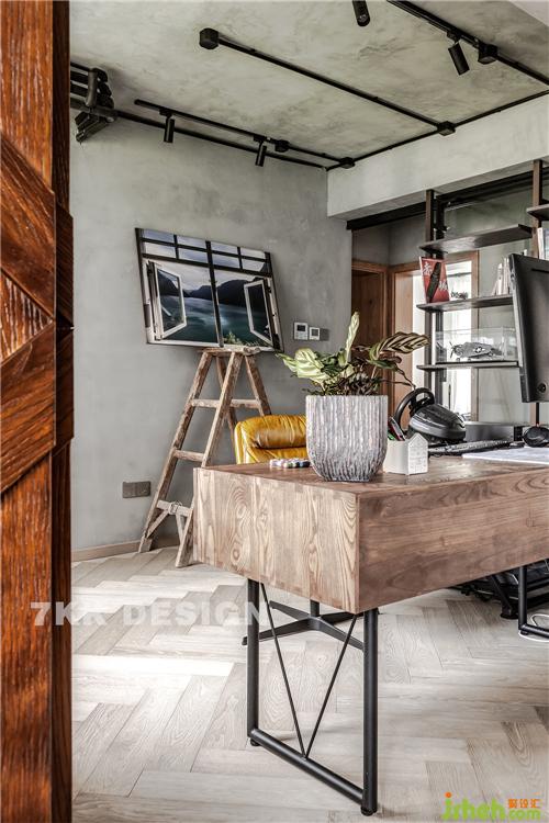 書房和過道一側(cè)的非承重墻也敲掉,用鐵藝和板式結(jié)合的開放架來做過道的隔斷,正好能放男主人的手工藝術(shù)品。同時彌補(bǔ)過道采光的不足。