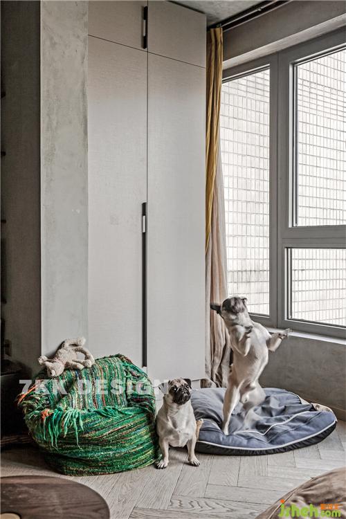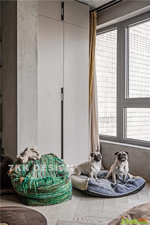 好個性的懶人沙發(fā)袋,靠墻做了一排收納柜.