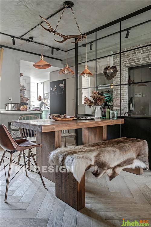 定制的吧臺柜下方做收納使用,墻面上也做了隔板架有序的放滿了食物,東西很多,卻雜而不亂,看出主人平時很愛干凈打理。柜子一側(cè)是定制的簾子,可以把狗狗隔離開來。