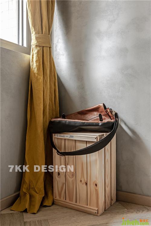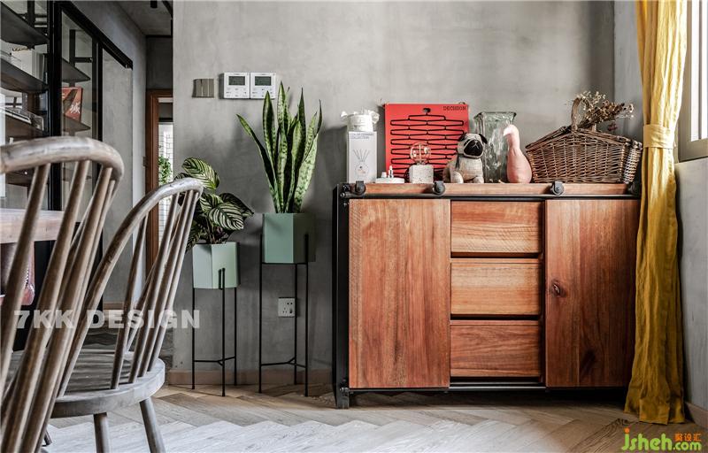 靠窗角落,精選的小型收納柜,上面采用也是滑軌移門,平時放置遛狗一些雜物。旁邊綠植的點綴給空間增加一份活力。黃色的窗簾搭配讓整體空間多了明亮溫暖的氛圍。