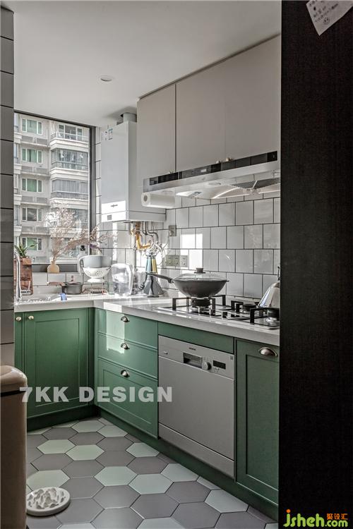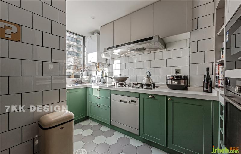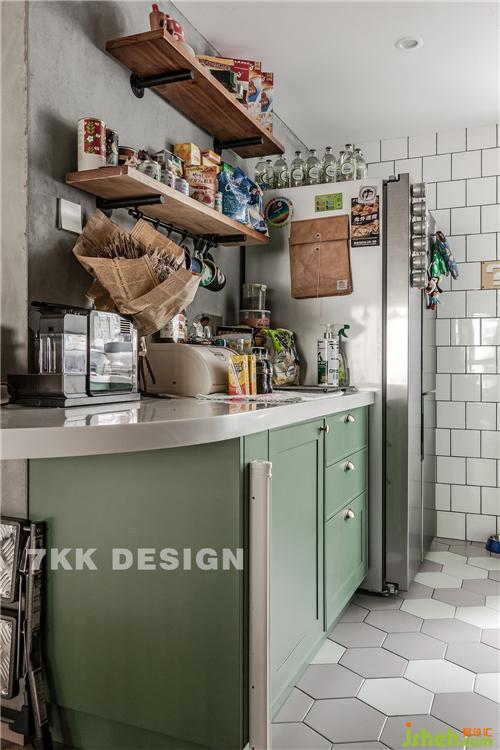 廚房打造干凈清爽的環(huán)境,墻面上選用白色墻磚,地磚采用菱形磚塊,櫥柜的顏色則是采用業(yè)主的意見,選用薄荷綠。因為業(yè)主習(xí)慣了國外的生活,平時喜歡吃的也是比較清淡類型的飯菜,沒有很重的油煙,打破原先的封閉式廚房改為了開放式廚房,擴大視野感,增加家人之間的互動性。