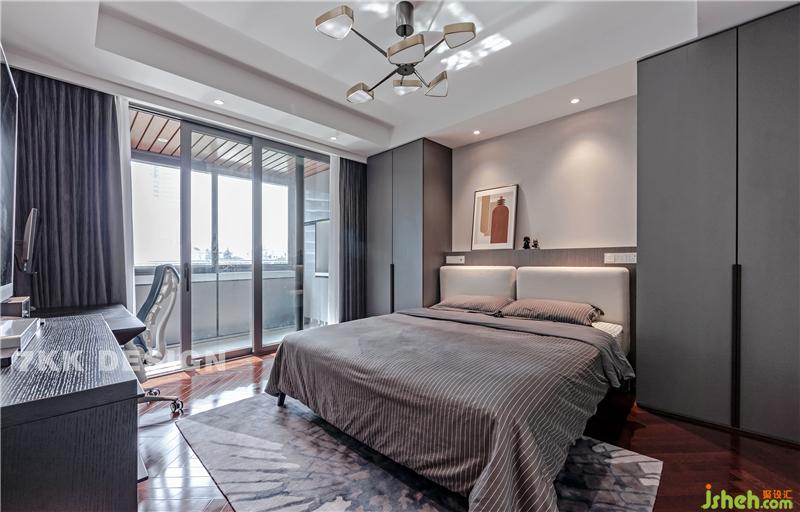 次臥擁有獨(dú)立陽臺(tái),作為洗衣晾曬休閑的空間,床尾深色的辦公桌椅和電視柜搭配,簡單而質(zhì)感。