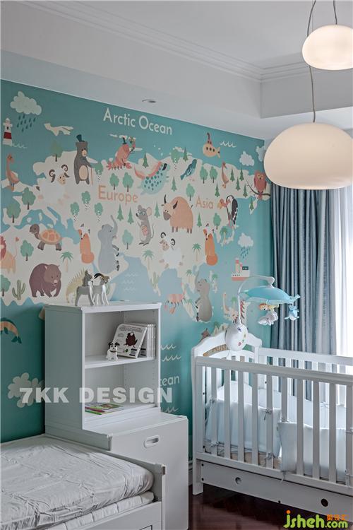 兒童房墻面選用藍(lán)色為基調(diào)很有童趣的壁紙作為裝飾,白色成品床下方抽屜增加收納搭配簡單的床頭柜也增加一些收納需求,靠窗放置一張嬰兒床,淺藍(lán)色窗簾營造夢(mèng)幻溫馨的兒童房。