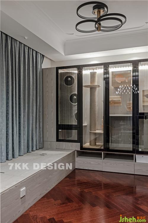 書房多功能房間設(shè)計(jì),靠窗定制榻榻米,下面可以收納,上面放上床墊,累的時(shí)候躺下也很舒適??繅σ粋?cè)是定制的很有趣味的貓屋哦,木質(zhì)與玻璃搭配,透過玻璃可以看到一個(gè)個(gè)可愛萌萌的貓爬架和小貓屋,下面開放格與抽屜結(jié)合增加收納。