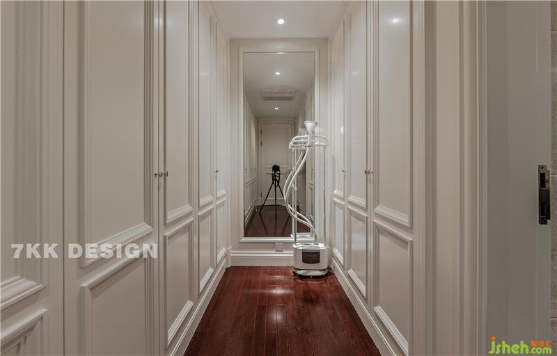 主臥衣帽間充滿線條感,純白色調(diào),白色隱形柜門搭配金屬門把手點(diǎn)綴,在走廊的盡頭一面到頂?shù)拇┮络R,最大面積地給予展示換衣效果,上海裝修設(shè)計(jì)從頭到腳都可以照得很清楚。主衛(wèi)從左側(cè)中間進(jìn)入,衛(wèi)生間門采用衣柜門一樣的造型設(shè)計(jì),讓整個(gè)衣帽間看起來更完整大氣,同時(shí)帶來一絲神秘感。