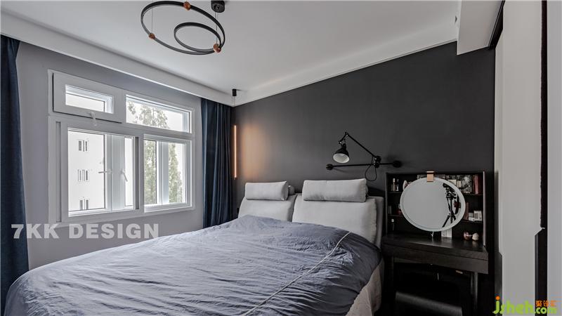 臥室一角選擇成品床頭柜,主要作為女業(yè)主的化妝桌,上面擺滿了女主人的化妝用品。個(gè)性的圓形鏡子搭配,很有意境。墻面?zhèn)€性的可以自由調(diào)節(jié)角度的臺(tái)燈,為看書或者化妝補(bǔ)光使用。