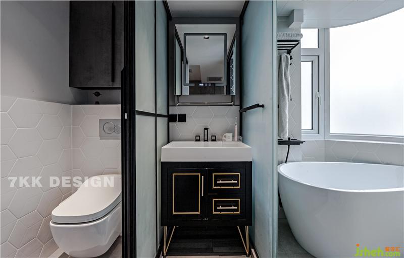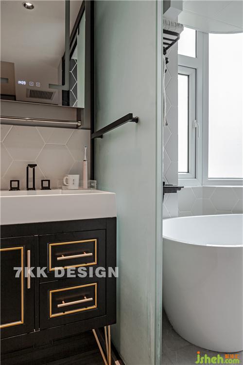 改變衛(wèi)生間的門的位置,衛(wèi)生間設(shè)計(jì)成現(xiàn)代比較流行的三分離式,馬桶,淋浴,干區(qū)獨(dú)立分開,使用起來也比較方便。 干區(qū)選擇黑色基調(diào)金屬元素勾勒的臺(tái)盆柜,超高顏值,時(shí)尚而精致,也方便打理。鏡子的搭配也很個(gè)性,正面可以顯示正常的時(shí)間和溫度,打開鏡子背面可以成小型收納空間放置日?;瘖y用品。 馬桶和淋浴空間都選擇磨砂玻璃移門,不影響采光,墻面采用白色菱形瓷磚拼接,打造干凈清爽的衛(wèi)生間空間。