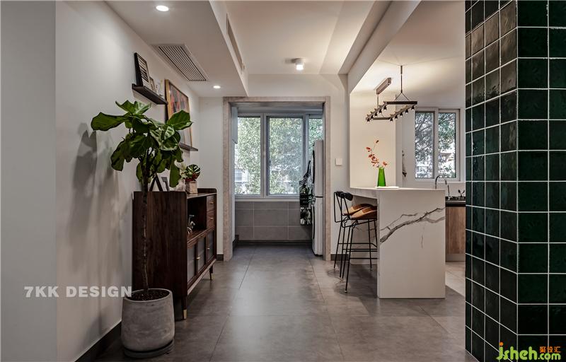 從玄關(guān)進來看餐廳視覺,簡約時尚,復(fù)古又清新。