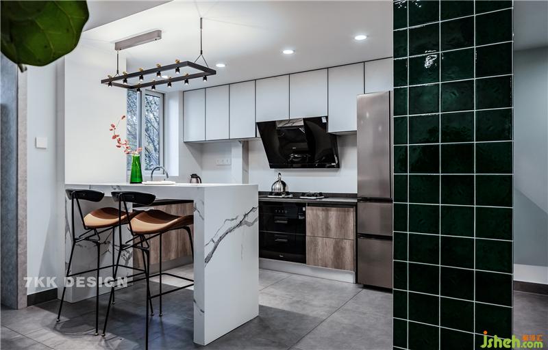 廚房L型的操作臺面。上下的櫥柜設(shè)計,增加更多的廚房收納空間。廚房臺面一側(cè)是成品冰箱。