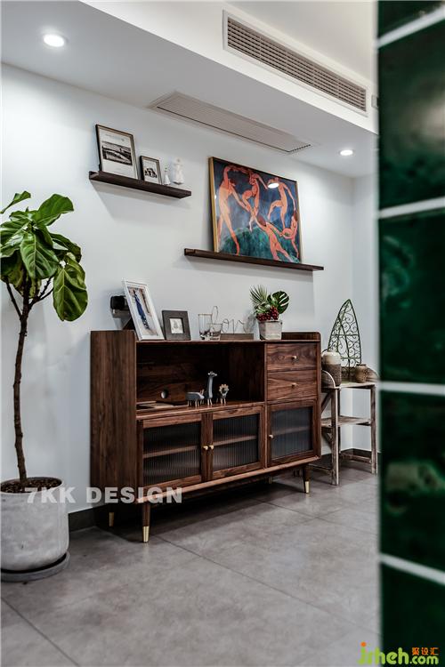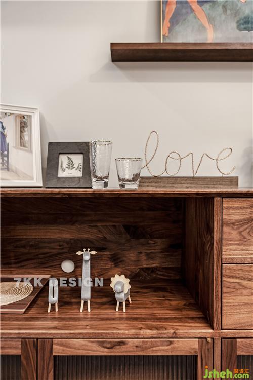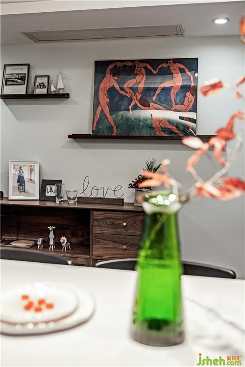 成品的餐邊柜里面暫時擺放的業(yè)主收藏的小飾品。上方的裝飾畫和玻璃杯也是設(shè)計師自己帶來給業(yè)主搭配的哦。