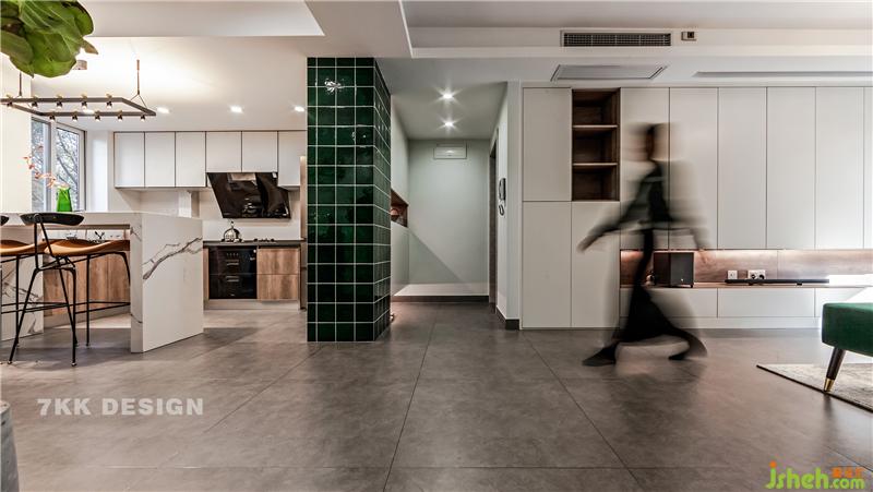 因為平時業(yè)主一家三口在吧臺上就可以解決三餐問題,如果有客人來,上海裝修設(shè)計暗藏在客廳定制柜里面的折疊餐桌就可以派上用場,放在過道中間,尺寸都是預(yù)留好的哦。