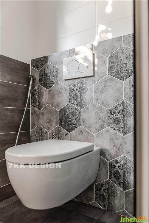 馬桶間,墻面選擇幾何形復(fù)古紋理的瓷磚+白色瓷磚拼接,時尚復(fù)古,干凈清爽。