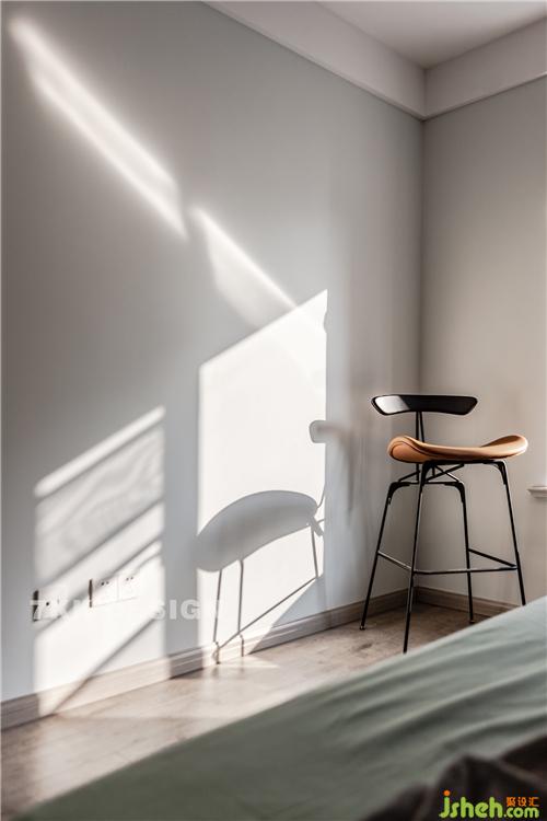 本來(lái)床頭設(shè)計(jì)師選擇的成品斗柜,業(yè)主暫時(shí)還沒(méi)買(mǎi),靠墻角放置一把高腳吧椅,上海裝修設(shè)計(jì)簡(jiǎn)約的線條在自然光線的照射下,有著強(qiáng)烈的光影效果。