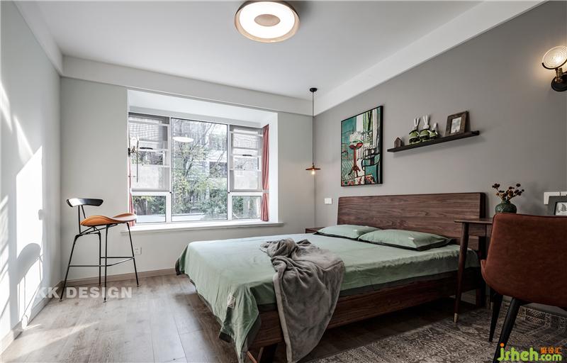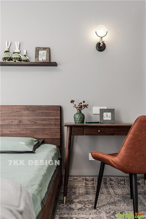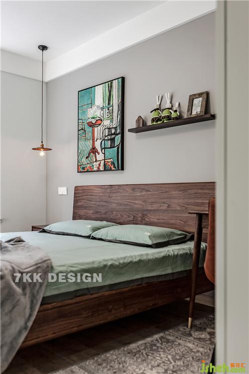 墻面抽象的綠色為主的裝飾畫(huà)和綠色的床品相呼應(yīng)。床+床頭柜+書(shū)桌和客廳斗柜餐廳餐邊柜都是成品選樣,營(yíng)造復(fù)古的文藝感。墻面的隔板裝飾讓床頭背景墻更加豐富立體。上面的一家三口的小白兔玩偶感覺(jué)很可愛(ài),很溫馨,讓人內(nèi)心暖暖的。
