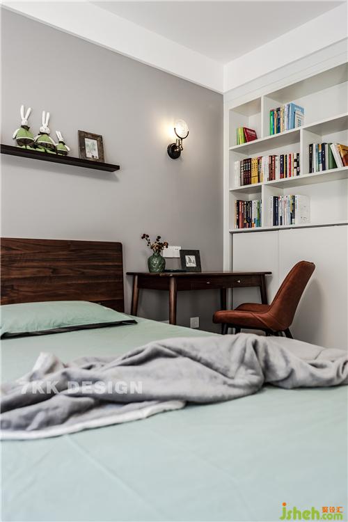 床和書(shū)柜過(guò)道中間鋪設(shè)的地毯提升空間的氣質(zhì),讓臥室更加溫馨而有質(zhì)感。