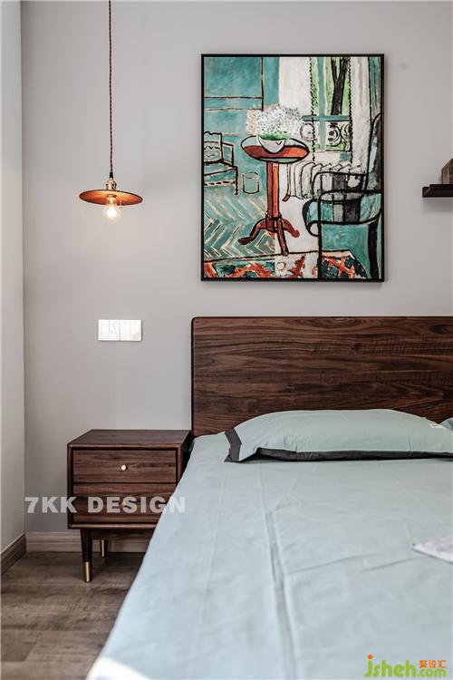 簡(jiǎn)約的床頭柜,精致的吊燈,一副裝飾畫(huà),搭配出精致充滿藝術(shù)的床頭一角。