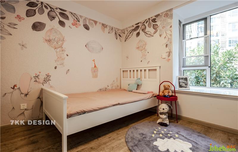 兒童房比較簡(jiǎn)約墻面一側(cè)鋪貼充滿童趣的壁紙,右側(cè)墻面白色和紅色花朵形狀的是比較有趣裝飾燈作為點(diǎn)綴。粉色的床品是每個(gè)女孩愛(ài)的童年色調(diào)。布偶娃娃也是快樂(lè)童年不可缺少的伴侶,很溫馨。