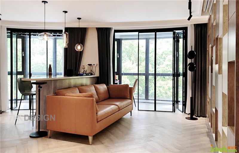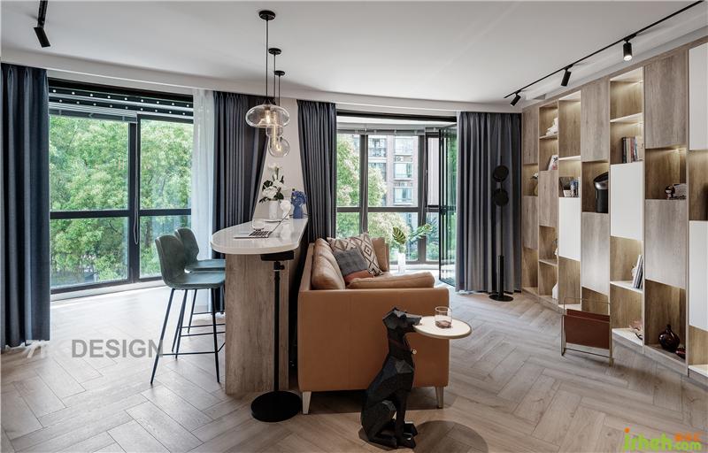 1、為使得原始不規(guī)則的客廳有個(gè)比較方正的空間,利用陽(yáng)臺(tái)中間的承重墻作為分隔,和客廳電視背景墻齊平定制一排吧臺(tái),吧臺(tái)一側(cè)不規(guī)則弧形元素更具設(shè)計(jì)感上海室內(nèi)設(shè)計(jì)師。 沙發(fā)背靠吧臺(tái)擺放,電視背景墻定制一整面到頂?shù)臅堋R驗(yàn)闃I(yè)主很少看電視,在書架頂部?jī)?nèi)藏投影幕布,平時(shí)看電影時(shí)可以放下來(lái)使用。這樣吧臺(tái)作為隔斷使得客廳空間一份為二,動(dòng)線更流暢。