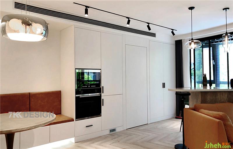 隱形門左邊是定制電器柜內(nèi)嵌烤箱、蒸箱、冰箱,隱形門右側(cè)是定制收納柜使用。
