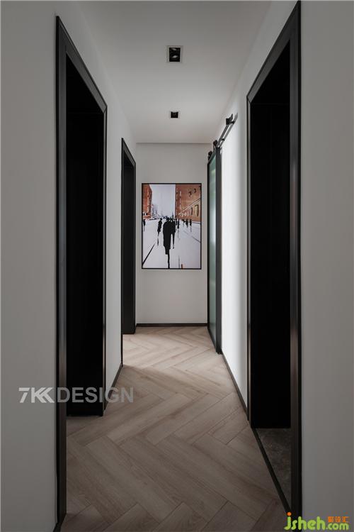 過(guò)道走廊盡頭一副裝飾畫(huà)點(diǎn)綴,過(guò)道兩邊房間的門(mén)套都選擇黑色不銹鋼門(mén)套,搭配白色的墻面賦予空間簡(jiǎn)潔大氣之感。