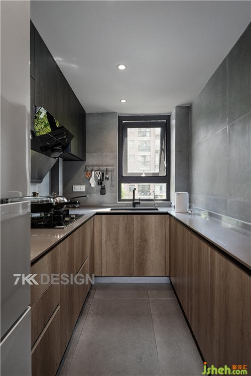 廚房U型空間設(shè)計(jì),超大操作臺(tái)面滿足業(yè)主洗切炒的合理動(dòng)線功能。灰色與木色搭配,打造質(zhì)感的烹飪環(huán)境。
