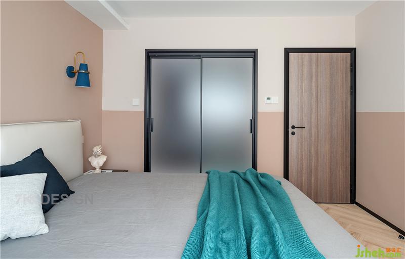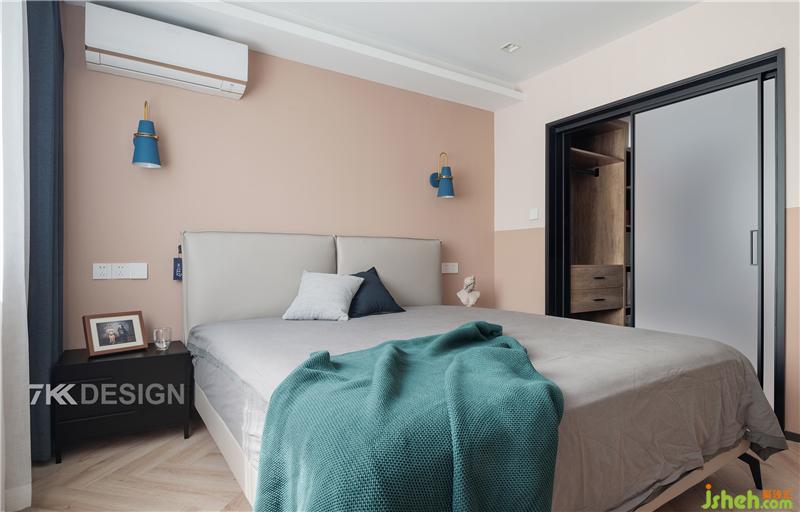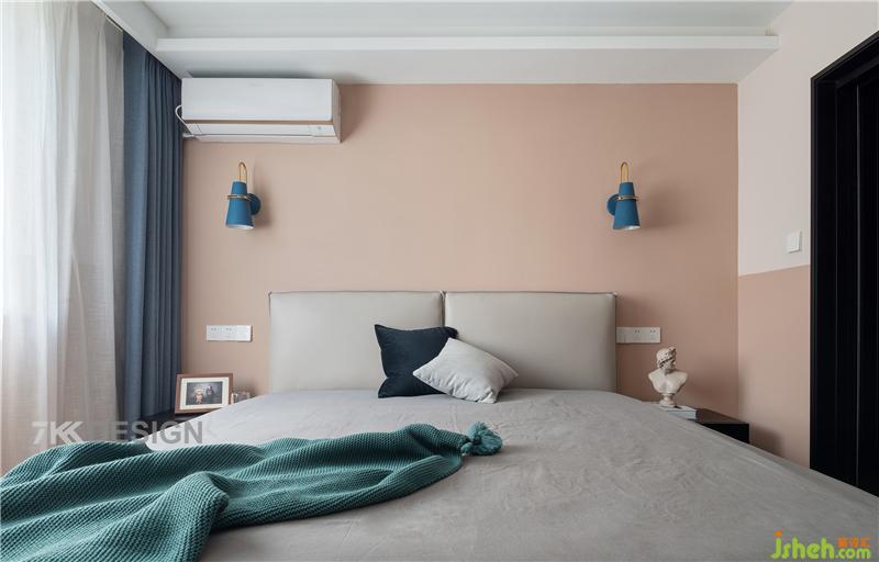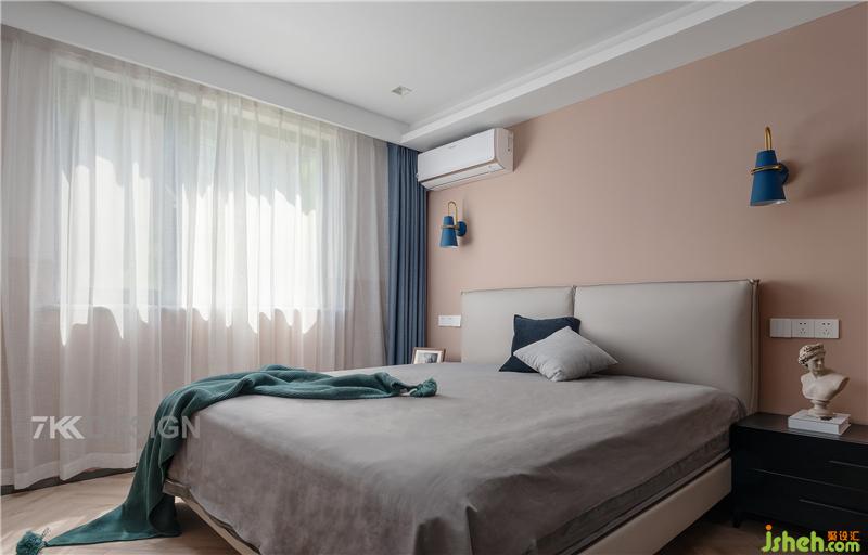 主臥床頭背景墻色調(diào)選用女業(yè)主比較喜歡的藏粉色,淺灰色床品搭配,窗簾雙層藍(lán)白結(jié)合,營(yíng)造溫馨舒適的睡眠空間。