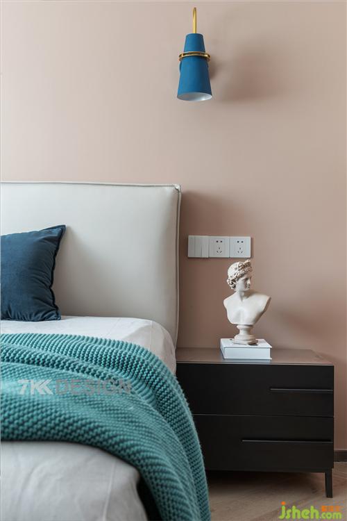 床頭黑色簡(jiǎn)約的床頭柜,墻面一盞藍(lán)色金框的壁燈搭配上方的藝術(shù)雕像裝飾,給空間帶來(lái)文藝質(zhì)感。