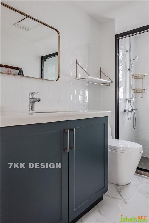 次衛(wèi)L型,臺(tái)盆柜+馬桶+淋浴房。也是白色為主,鏡框+裝飾架金屬元素點(diǎn)綴,營(yíng)造精致清爽的衛(wèi)生環(huán)境。