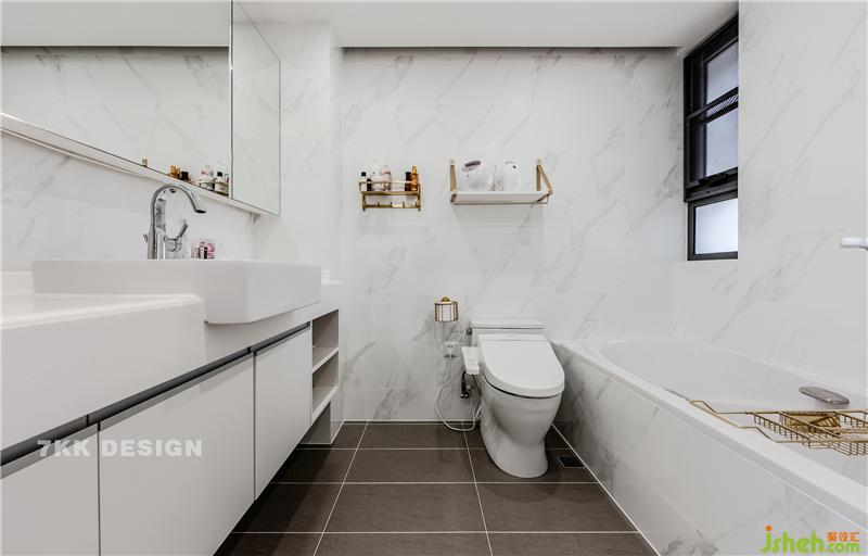 主臥衛(wèi)生間,業(yè)主比較喜歡明亮的感覺(jué),墻面+洗手臺(tái)面+浴缸都是以白色為主,深灰色方形地磚拼接,干凈清爽。打開(kāi)鏡柜里面暗藏更多的收納功能哦。