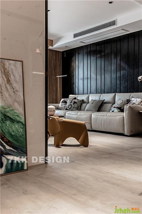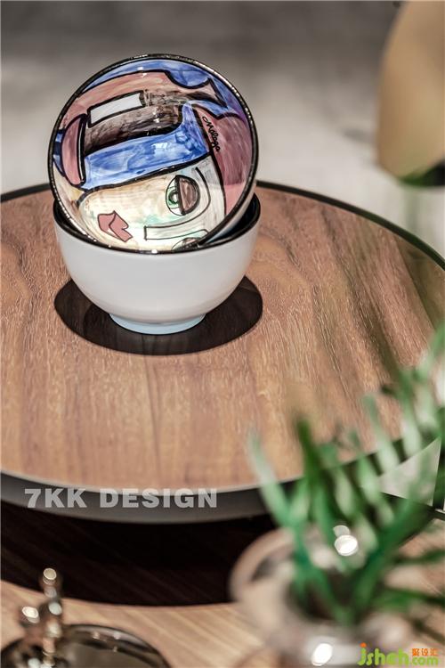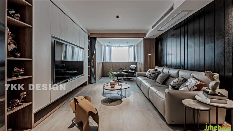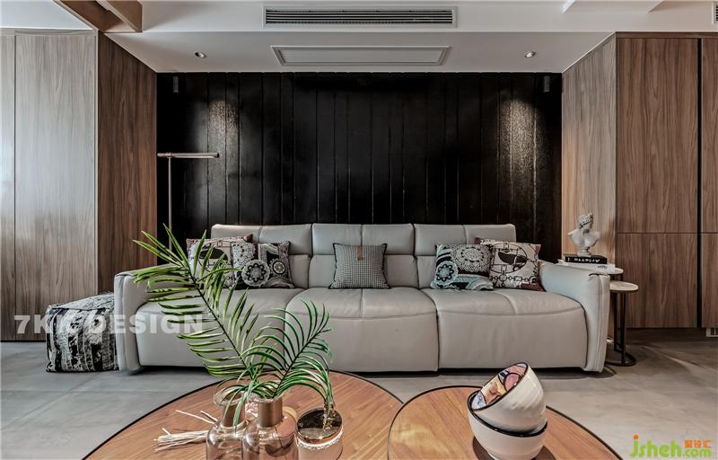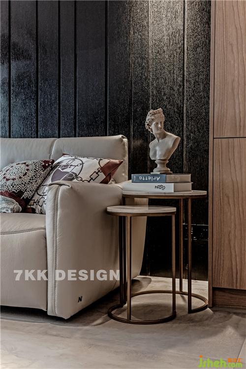 客廳和陽臺中間利用窗簾作為功能劃分,拉上窗簾,陽臺放上一張單人沙發(fā)椅,變可作為獨立的閱讀休閑空間,上海裝修設(shè)計平時作為客廳一部分,擴大客廳空間面積。陽臺兩側(cè)靠墻定制到頂?shù)墓褡樱看岸ㄖ瓢?,既增加臺面裝飾又增加收納功能。 窗簾盒和門套都是采用木飾面,客廳和陽臺無主燈設(shè)計讓頂面更加簡潔干凈,視覺上顯得層高更高,光線更加均勻,可以更加有層次的利用光線,配合落地燈,筒燈營造不一樣的客廳休閑照明氛圍。 圓形藝術(shù)茶幾錯落搭配,精致實用。