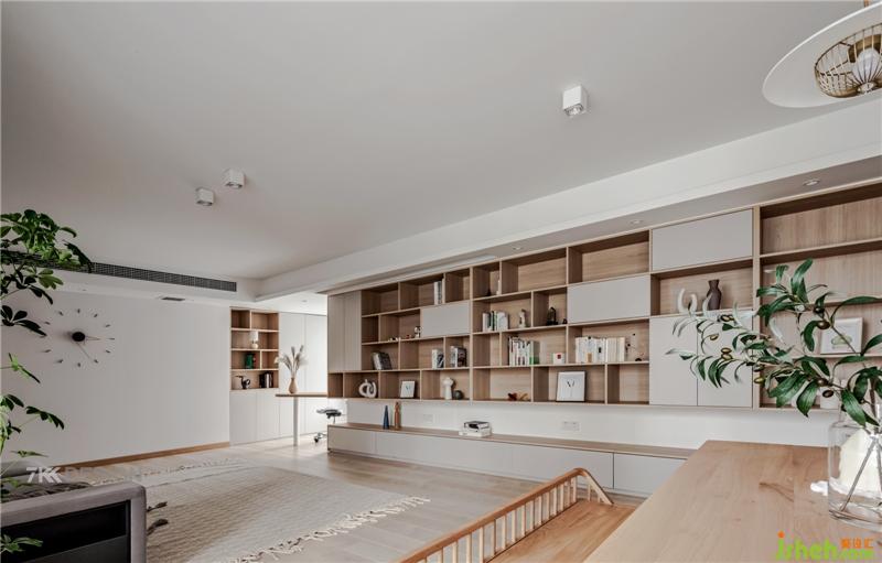 業(yè)主家有一個(gè)3歲左右?guī)洑庥终{(diào)皮的小朋友,平時(shí)不希望小朋友多看電視,所以上海室內(nèi)設(shè)計(jì)師客廳舍棄了電視機(jī),做了升降投影幕布,用作平時(shí)的觀影娛樂??蛷d的電視墻做了一整排定制柜,平時(shí)可以用來收納物品,擺放書籍,家居擺件,一區(qū)多用。