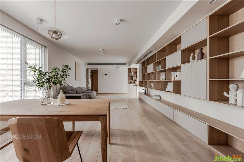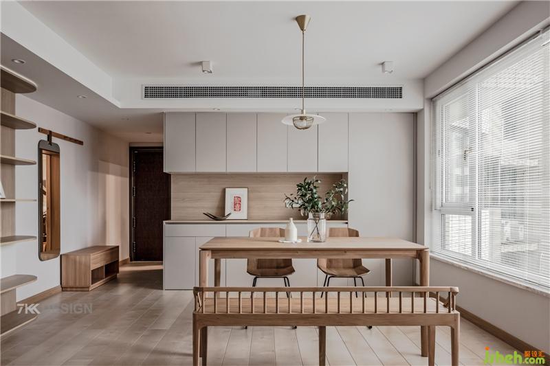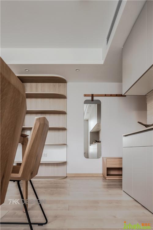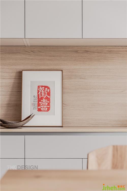 餐廳以光和白色配合,勾勒出朦朧的清透感;又選擇較有厚重感的餐桌椅,使空間整體輕盈而又不失穩(wěn)重,符合三代共同居住的生活習(xí)慣。陽光通過百葉窗灑落在原木色餐桌上,大自然的造物神奇且美妙。