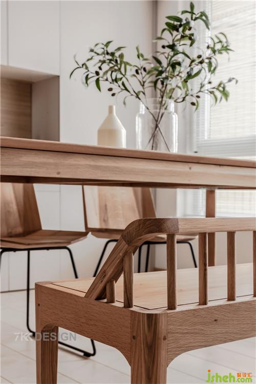 熹山工坊的木桌,設(shè)計(jì)簡潔舒適,搭配同色系的木質(zhì)餐椅,很是耐看。桌上的一株綠植為空間增添了一抹生機(jī)。