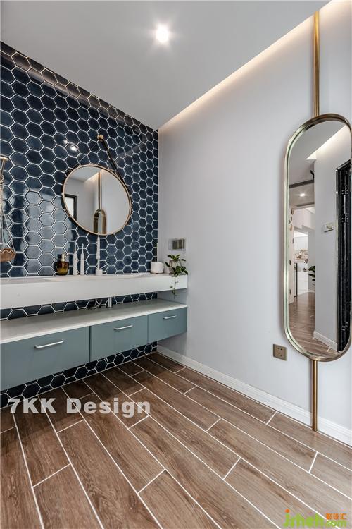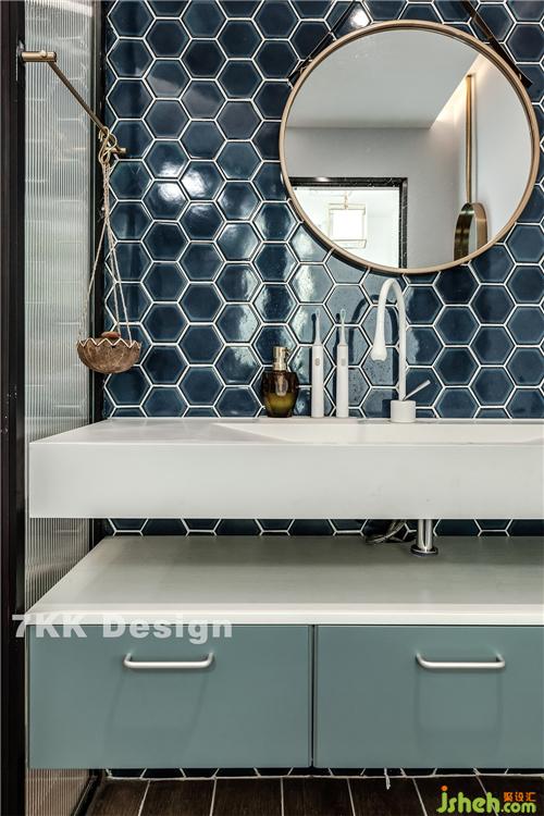 整個(gè)洗漱臺(tái)的亮點(diǎn),在于它的水槽,從兩邊開(kāi)始傾斜,極具設(shè)計(jì)感。背景選用菱形墨藍(lán)色磚塊鑲嵌,配合些許的金屬色點(diǎn)綴,看上去更帶著一絲輕奢感。