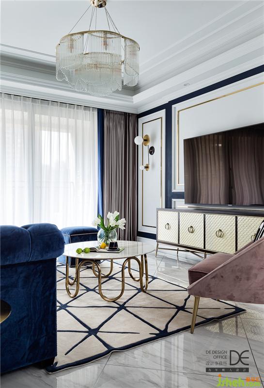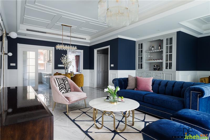 通透的采光將粉藍搭配的美發(fā)揮到極致,客廳以深灰色為主調,部分墻面的藍色,與深藍沙發(fā)達到了統(tǒng)一,輕奢風格的金屬元素,使浪漫精美的居室空間也不失輕快與活力。