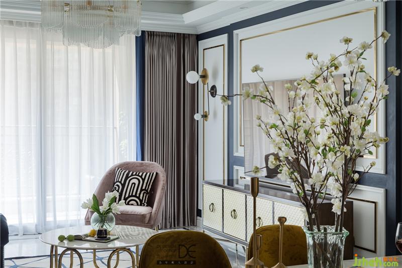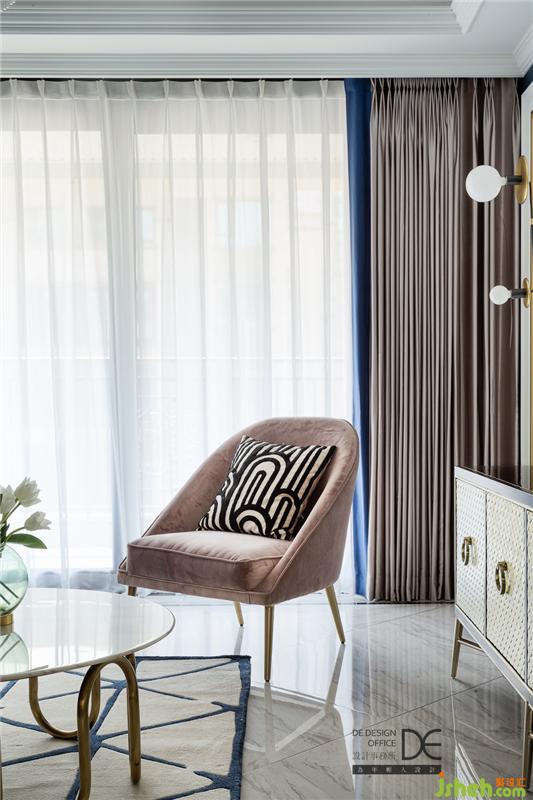 客廳的窗簾用色整體素雅和諧。橫平豎直的空間線條里,絲綢質感的窗簾提升了空間的質感。絲絨、金屬、石材等材質亦悄然置入,美式與輕奢風格大膽融合,相得益彰。