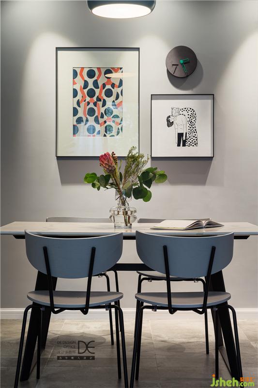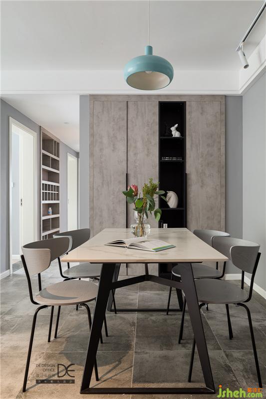 大理石紋理的餐桌搭配水泥色的地磚,簡潔明朗。餐廳的柜子保留了現(xiàn)代的寂靜,孔雀藍(lán)的燈具更是點(diǎn)睛之筆,為餐廳增添了一份特有的溫馨之感。