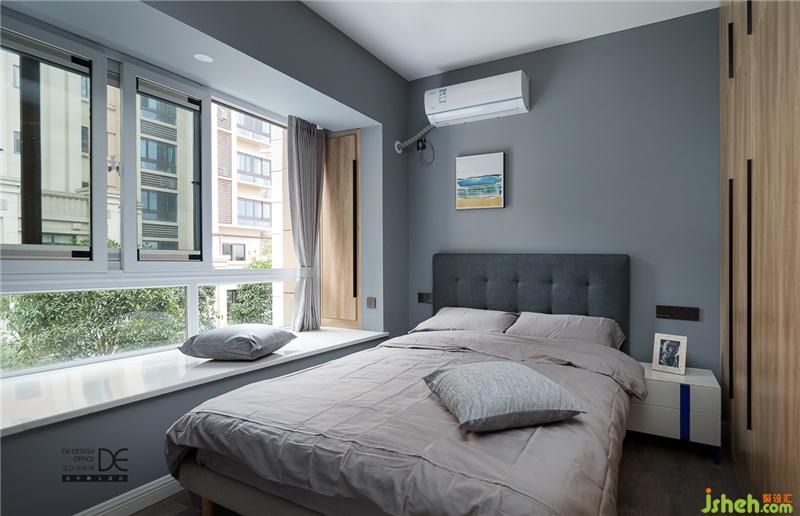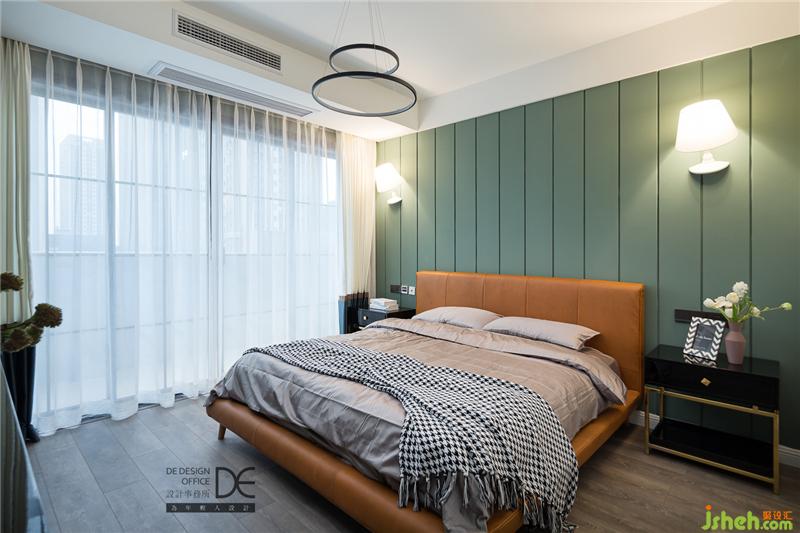 用石膏板拼縫,刷上清新的綠色,沉穩(wěn)造型配上活躍色彩,營造出主人房氛圍;土黃色大床配上黑色床頭柜,看似雜亂實則穩(wěn)中有序,涌出溫馨典雅的格調。工作勞頓后,回到房間時自然將繁雜之事拋于腦后,享受這份身心愉悅之感。