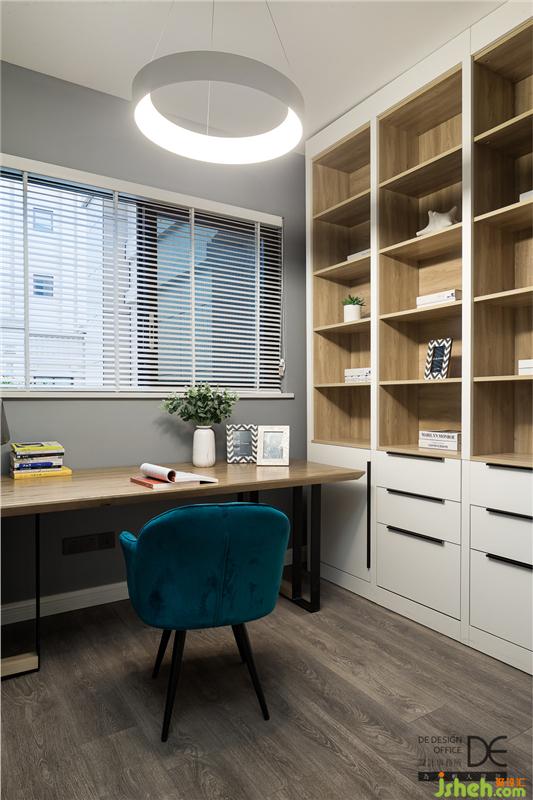 淺灰色墻面搭配原木色柜子和書桌,清新自然;藍色的座椅與整個設計交相呼應,成為書房的點睛之筆,為伏案勞頓的主人帶來一絲輕松愜意。