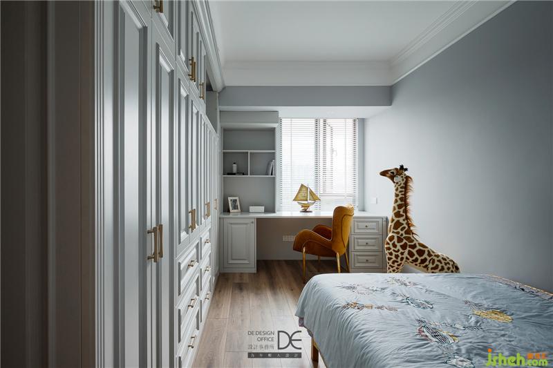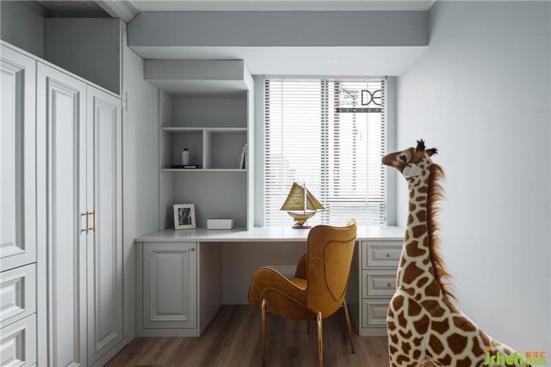 哥哥的房間延續(xù)睡眠空間的柔和感,云朵床和動物元素增加了空間的童趣,心愛的動物們相伴左右,共同制造著男孩輕快的童年,有趣的長頸鹿擺件更是成了空間的亮點。