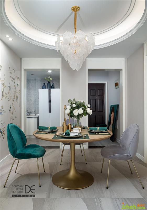 站在餐廳,可見門廳和廚房門洞的對稱處理,有線條的落樘門板搭配花鳥墻畫,彰顯餐廳的端穩(wěn)雅致,整個空間在花瓣吊燈的映襯下光韻流轉(zhuǎn),呈現(xiàn)著高貴的氣質(zhì)。