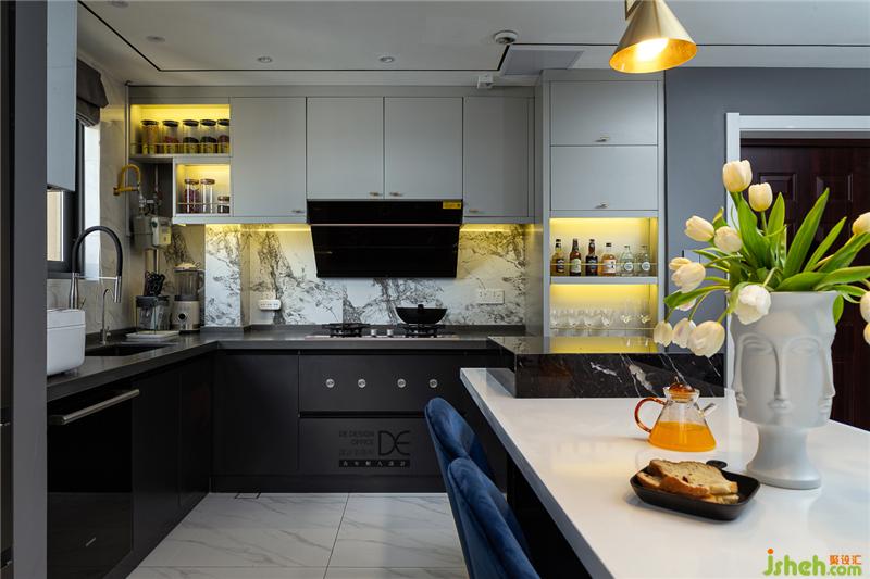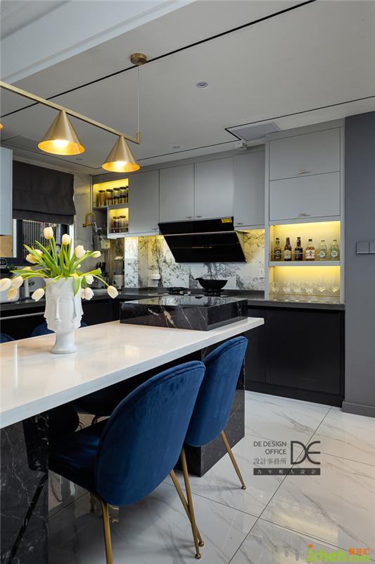 島臺和餐桌結(jié)合,黑色石材和白色石材相碰撞,配上藍色絲絨餐椅,讓餐廳既豐富多彩又恰到好處,就想和你在這里共進晚餐。