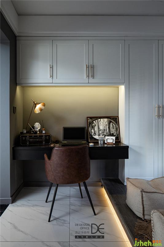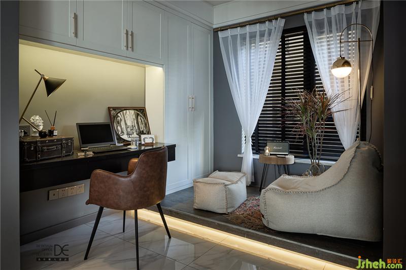 這里不僅有書房的功能,還保留了一個地臺作為休閑角落。設(shè)計師在地臺邊緣精心設(shè)計了燈帶,讓整個空間更具層次感的同時,又增加了一絲浪漫之感。